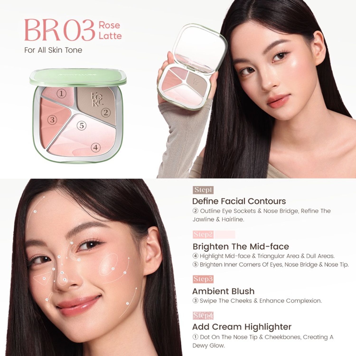 ✔ Contour + Blush + Brightening + Highlighter-ийг нэг дор багтаасан тул авч явахад хялбар